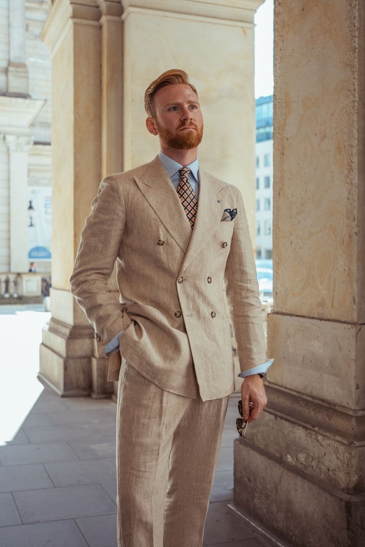 Compared with wool suits, linen suits are lighter and perfect for walking around cities or attending outdoor events.